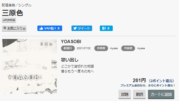 music.jpを使ってYOASOBIの『三原色』をダウンロードする手順も簡単。